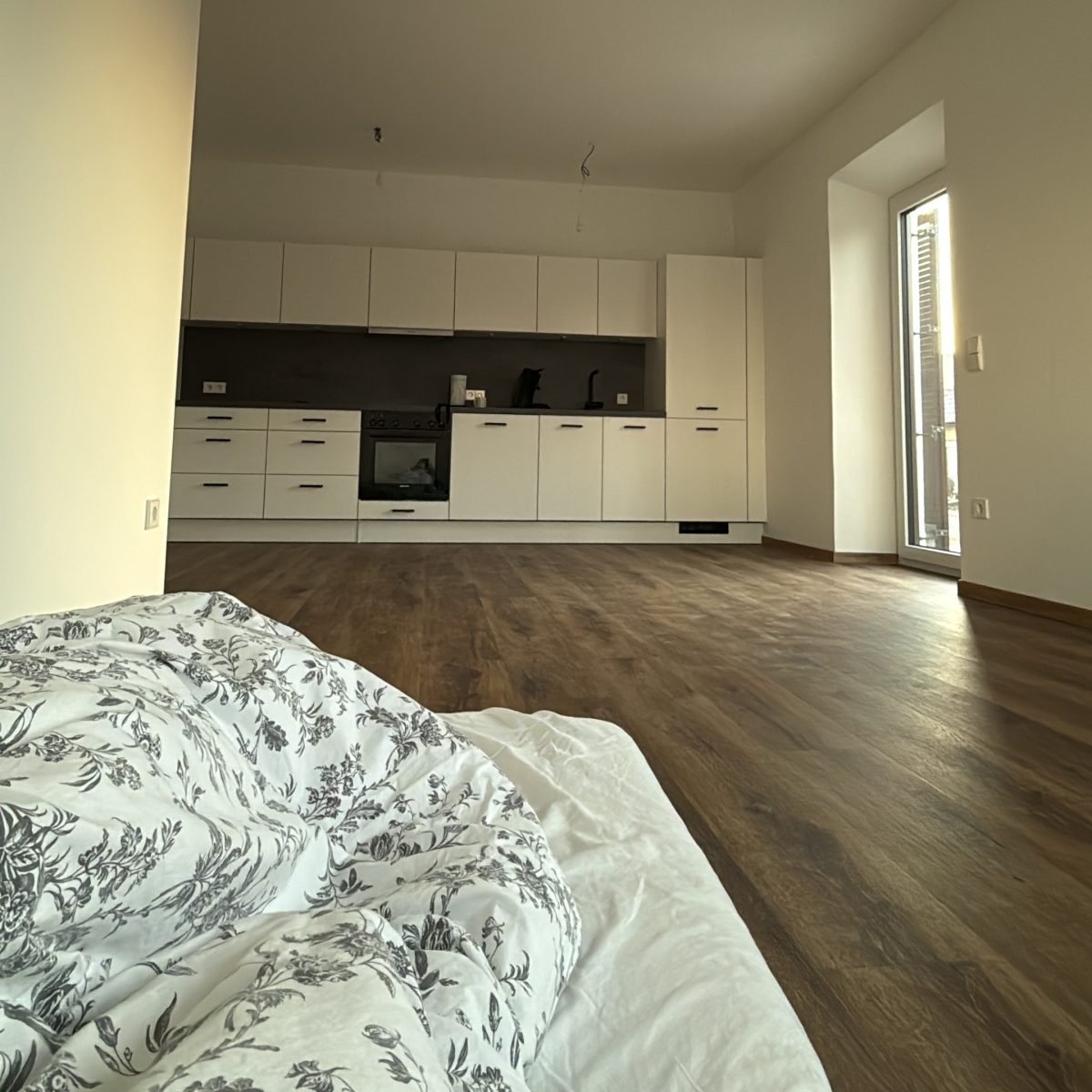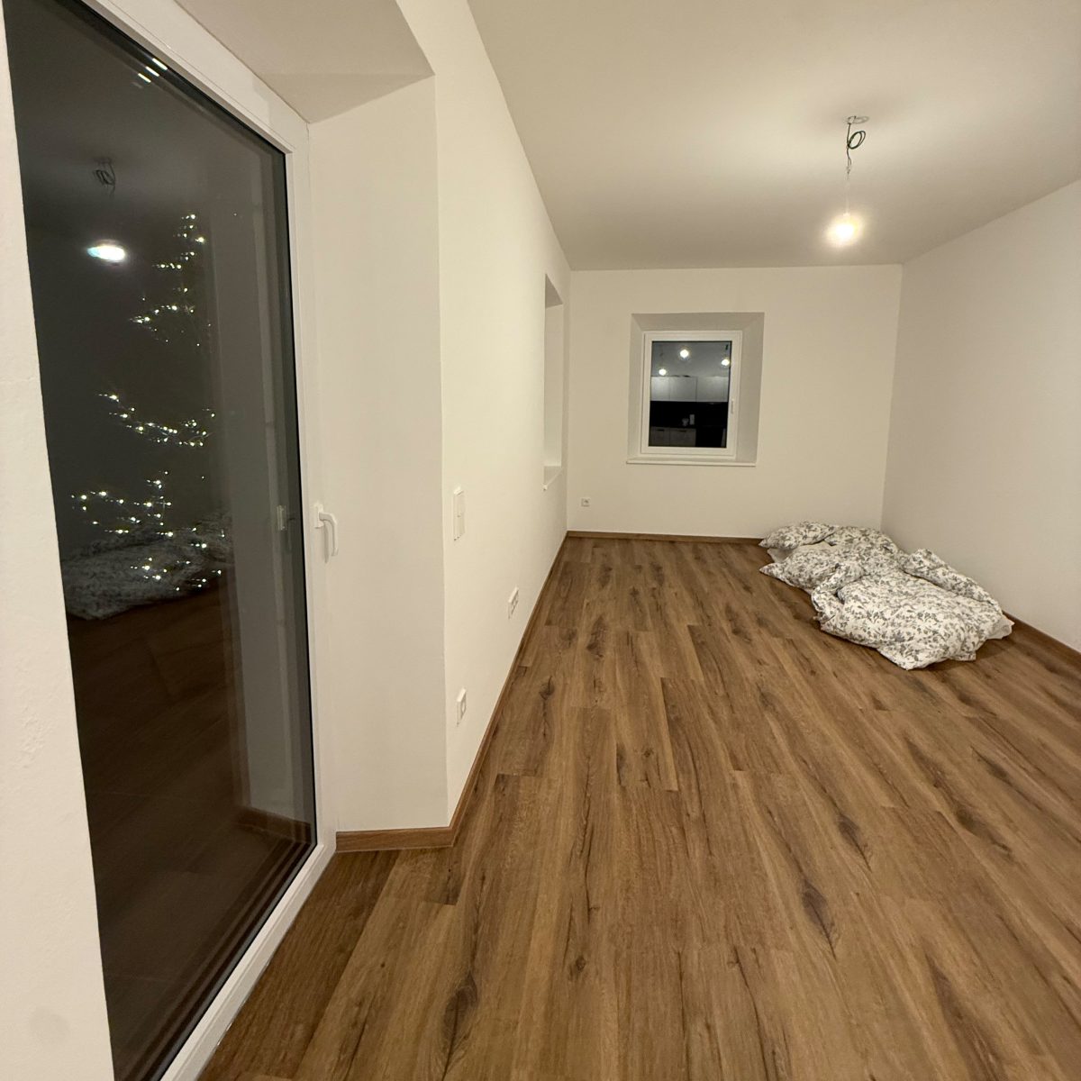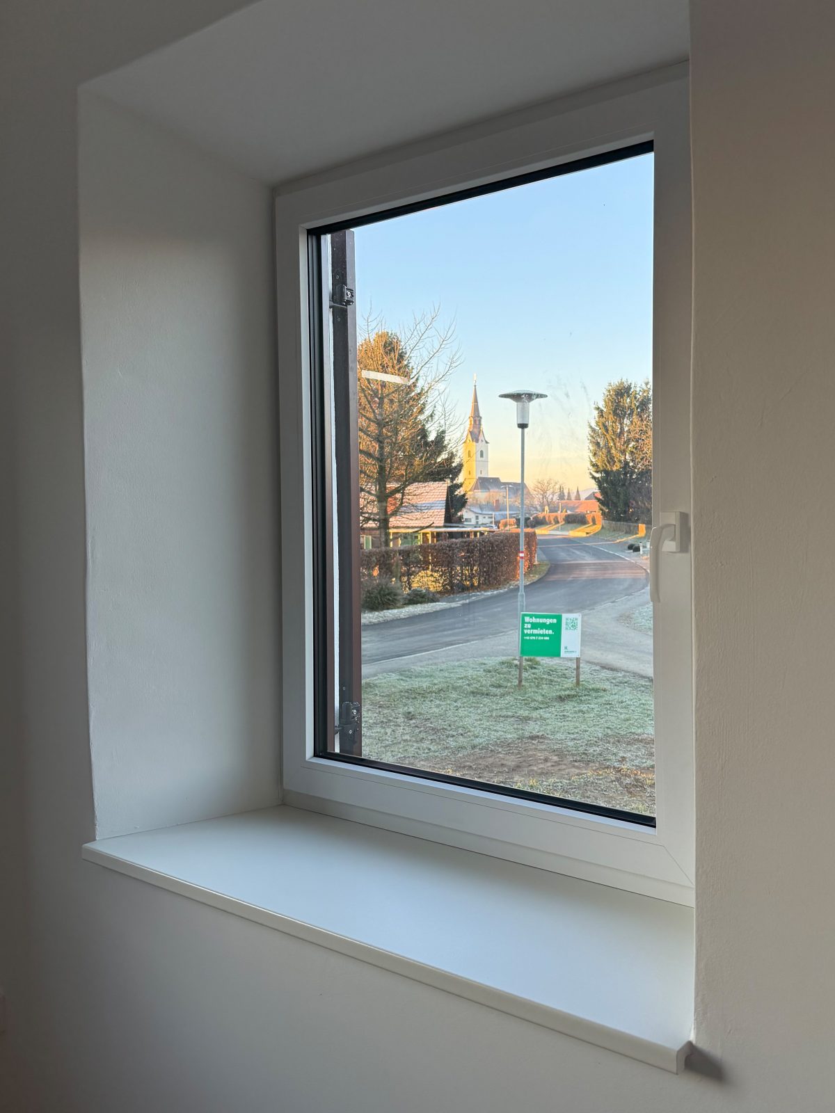 Gesagt getan, Ende November habe ich Matratze, Bettzeug und eine Klopapier-Rolle eingepackt und es mir im Wohnzimmer von Top 1 („Hengsberg-Blick“) gemütlich gemacht. Hier war früher bereits das Schlafzimmer meines Onkels, der den Blick Richtung Dorfzentrum genossen hat. Vor dem Fenster stand ein Tisch, von dem aus er das Treiben draußen beobachten konnte.