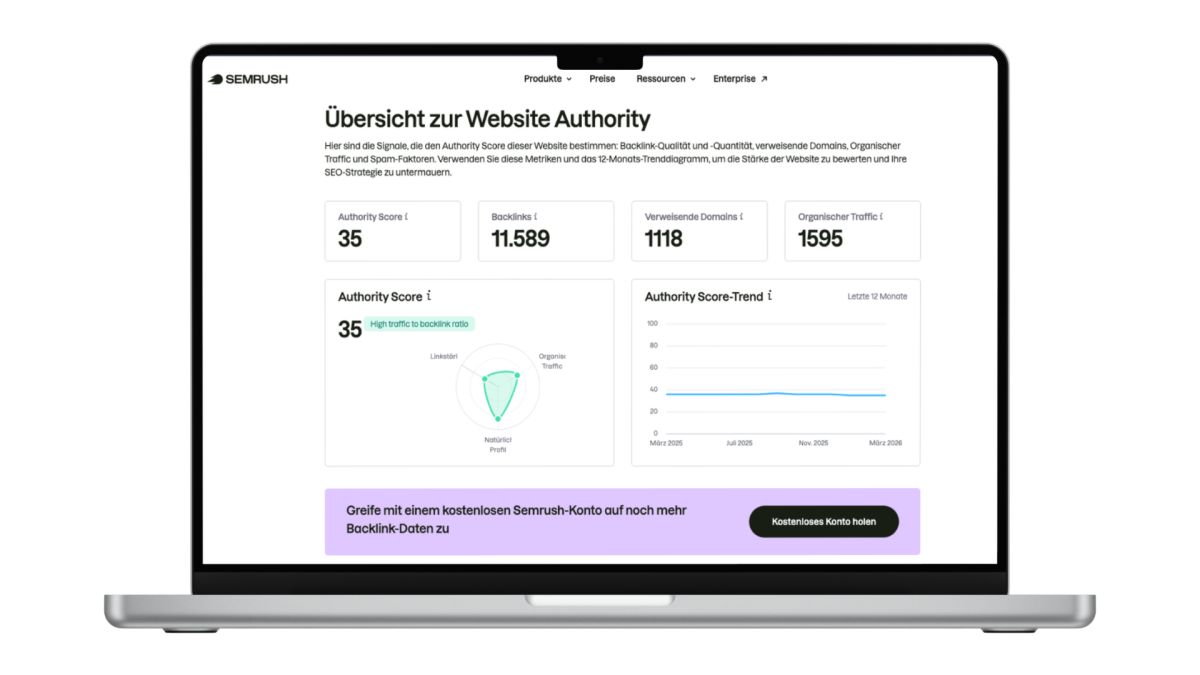 Du kannst deine Domain Authority ganz easy online checken lassen, etwa mit dem SEO-Tool Semrush. Dabei bekommst du einen schnellen Überblick, wie es um deine Backlinks und die Link-Qualität steht.